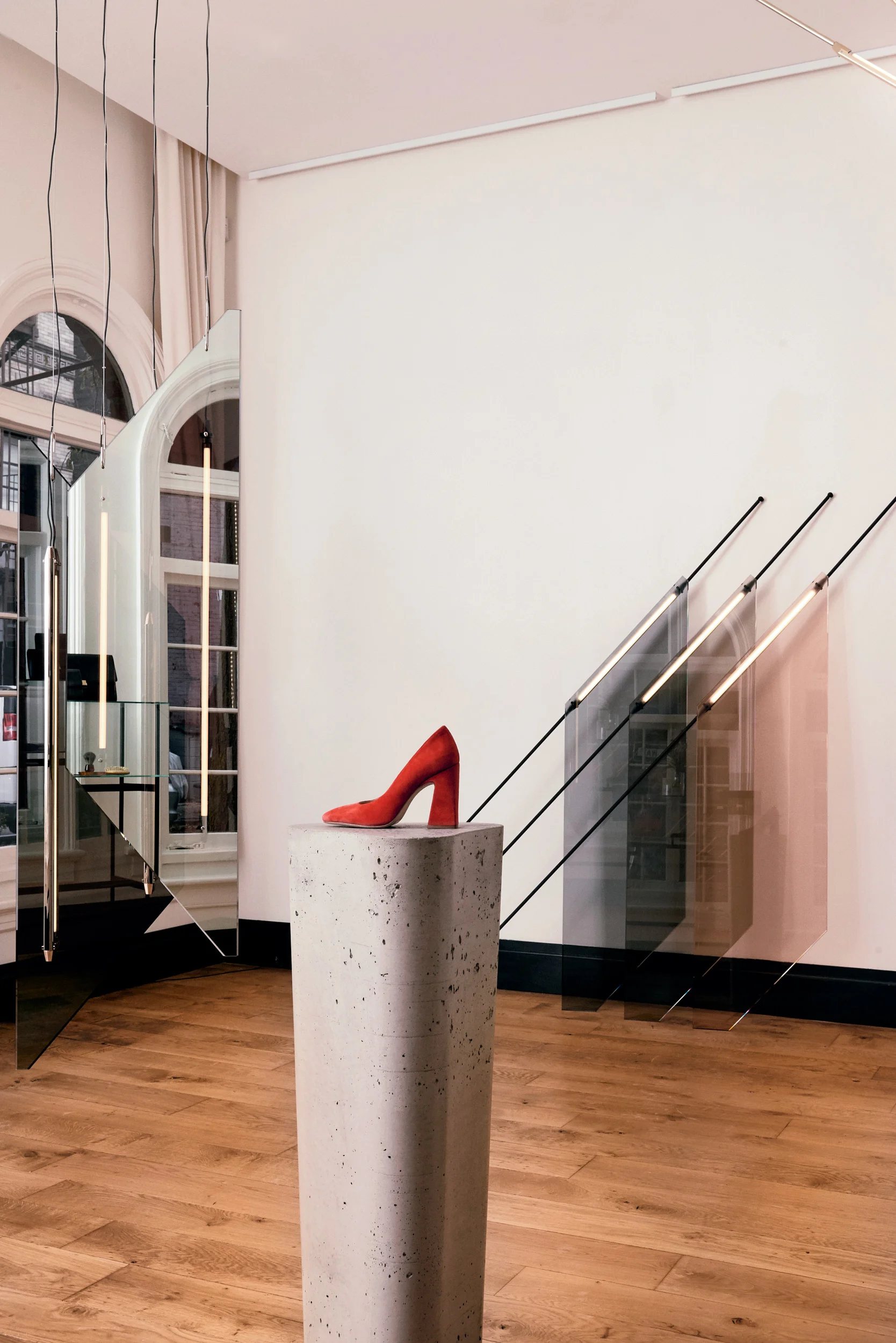 The first showcase features New-York based lighting designer, Bec Brittain with a new installation of her acclaimed, playful and sculptural Shy beam pieces entitled Perception + Reflection. Simple and sophisticated, her handcrafted LED beams can be arranged in endless ways brilliantly transforming an interior with each configuration. Her custom lighting installation for the boutique features a series of suspended trapezoidal mirrors and cylindrical LED tubes that hang and interact with the light. ‘Climbing Beams’, thin LED tubes combined with modular brass hardware connect the wall to the ceiling while ‘Wall Flags’, which combine the brass tube beams with sheets of peach, grey and smoked glass, seem to rise from the floor to climb up the walls. ‘Hanging Flag’, another interplay between the LED beams and one large, flag-shaped sheet of glass, casts the store aglow in a peachy palette.